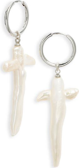 Organically-shaped crosses of lustrous freshwater pearl anchor these huggie hoop earrings that will always make a statement.