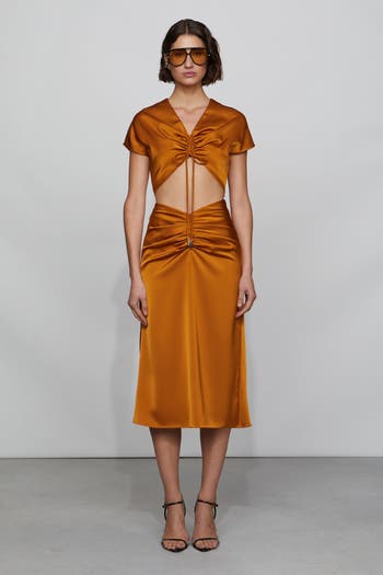 This cropped satin top is ruched and tied at the front, spliced with angular cutouts and a sharp V neckline. Finished with cap sleeves and metal-tipped ties.