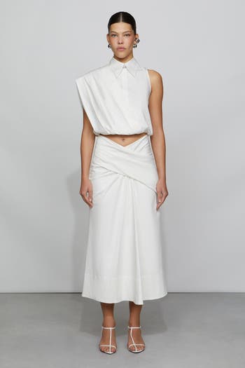 A clean silhouette, disrupted. This cotton poplin midi skirt features a sharp twist detail that skims the hips and shifts the structure. Minimal, with intent.