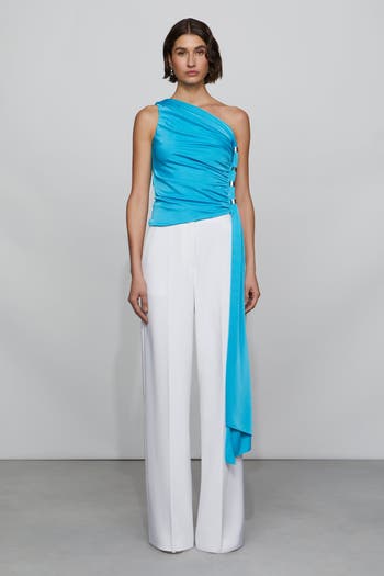 Asymmetric and high-shine. This one-shoulder top in gloss jersey is ruched with silver-tone hardware and finished with a fluid drape. Clean lines, maximum impact.