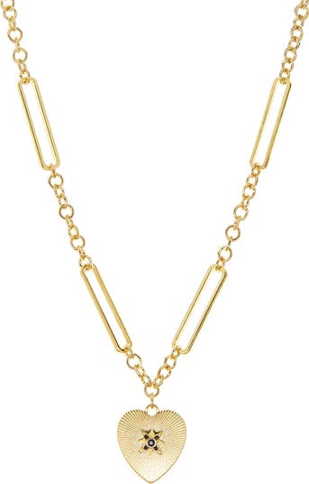 A mixed-chain necklace is bursting with romance and sparkle thanks to an etched heart pendant centered with black crystals.