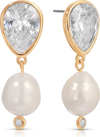Thrill your lobes with the exciting sparkle of these drop earrings adorned with faceted cubic zirconia and glossy freshwater pearls.