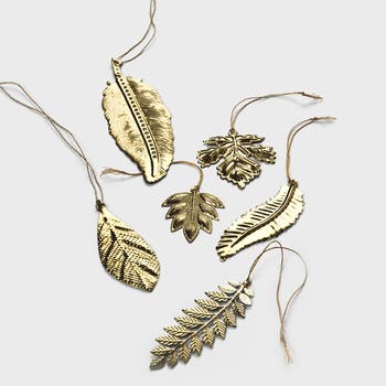 Grace your holiday décor with this exquisite set of brass leaf ornaments. Meticulously crafted in delicate botanical forms, each piece bears a soft golden lustre that catches the light with quiet elegance. Whether suspended from the boughs of a tree, nestled into a garland, or adorning a table setting, they lend a note of enduring refinement to seasonal celebrations. Set of 6 Hanging Ornaments