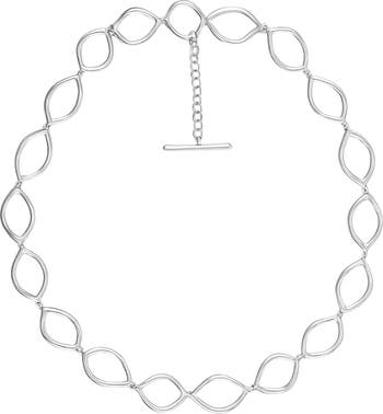 This striking necklace showcases a modern and organic design with elegant curves, perfect for making a bold yet sophisticated statement. The polished sterling silver finish adds a sleek, refined touch to this unique piece.