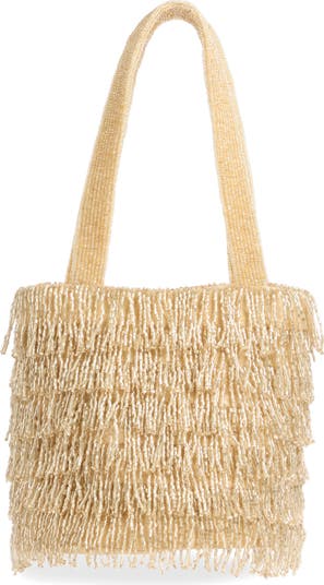 Tiers of beaded fringe cascade down an evening-ready bag designed with a spacious interior and suspended from lustrous shoulder straps for hands-free wear.