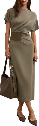 Made for desk days and drinks dates, this softly sculpted dress features graceful draping and a ribbed accent to highlight the shape of the waist.