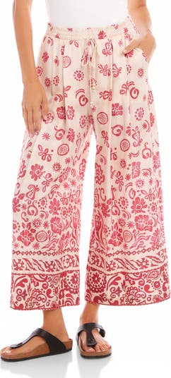 A stunning watercolor-inspired print adds vacation-ready vibes to these lightweight cotton-enriched pants designed with a comfortable drawstring waist and flowy wide legs.