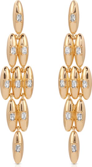 Domed ovals bring liquid shine to swingy chandelier drop earrings highlighted by sparkly baguette crystals.