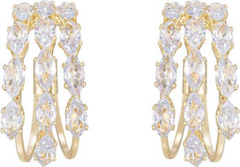 These 18-karat gold-plated hugging earrings are set with faceted crystals that gleam against the light with every head turn.