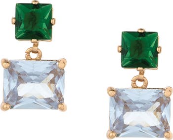 Prong-set square crystals stack, one in green and one clear, in these double-drop earrings .