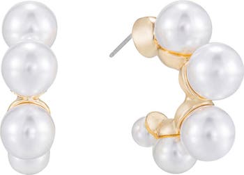 Graduated imitation pearls enrich classy 18-karat gold plated huggie hoop earrings.