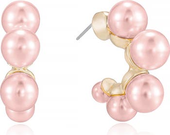 Graduated imitation pearls enrich classy 18-karat gold plated huggie hoop earrings.