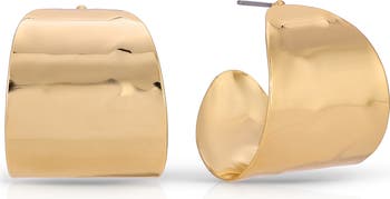A hammered finish catches the light on wide huggie hoop earrings finished in gleaming 18-karat yellow gold.