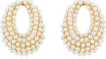 These handmade earrings in a swooping shape are studded with gleaming imitation pearls for an extra element of glamour.