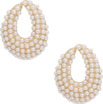 These handmade earrings in a swooping shape are studded with gleaming imitation pearls for an extra element of glamour.