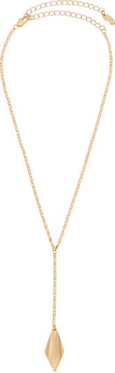 A dainty Y-necklace catches the light with flattened links and a geometric pendant finished in high-shine 18-karat gold.