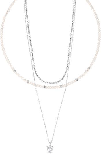 A cubic zirconia tennis chain, freshwater pearl strand and heart charm make a perfectly glam trio to give this layered necklace a timeless stacked look