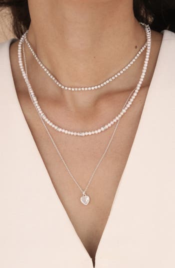 A cubic zirconia tennis chain, freshwater pearl strand and heart charm make a perfectly glam trio to give this layered necklace a timeless stacked look