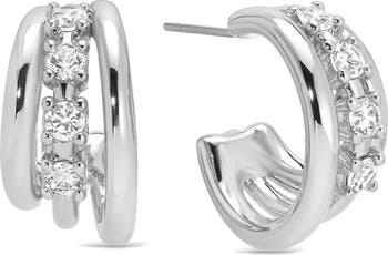 Prong-set cubic zirconia sparkle down the center of these multilayer hoop earrings plated in shiny 18-karat gold.