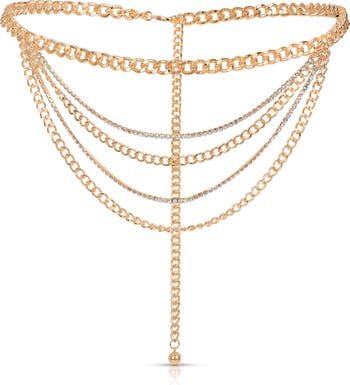 Add sparkle and shine to your next evening out with this draped chain belt that's interspersed with light-catching crystals.