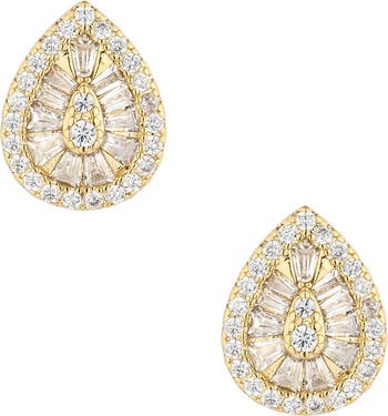 Elegantly illuminate your ensembles with these petite cubic zirconia teardrop stud earrings plated in glowing 18-karat gold.