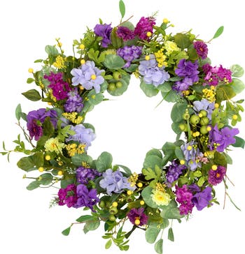 Create a vibrant botanical accent with this purple hydrangea and eucalyptus artificial floral wreath. Designed with a balanced mix of color and texture, the artificial wreath features bold purple hydrangea blooms surrounded by lifelike eucalyptus leaves, small flowers, and varied green foliage. Yellow and green berry accents are carefully placed throughout the arrangement, offering contrast and depth that evoke the freshness of seasonal garden growth. Crafted to provide a long-lasting, maintenance-free decorative solution, this wreath suits a variety of spaces—entryways, front doors, walls, or mantels. The layered arrangement of floral and greenery elements creates a natural look, offering visual interest from every angle. The purple, green, and yellow hues work together to bring a warm and inviting feel to spring and summer decor, while still being versatile enough for year-round use. Constructed on a sturdy circular base, the artificial flower wreath maintains its shape and color without the need for watering or pruning. Its lightweight design allows for easy hanging and repositioning indoors or in covered outdoor areas. Whether used in a farmhouse, traditional, or transitional setting, this purple hydrangea and eucalyptus wreath serves as a cheerful decoration with rich texture and dimension that suits a range of home decorating styles. Features: Natural twig grapevine backing for hanging Recommended for indoor use only, or covered outdoor use No assembly required - wreath comes in 1 piece Dimensions: 24" diameter (measured from outermost edge to outermost edge across the wreath) Material(s): polyester/twig/wire/plastic