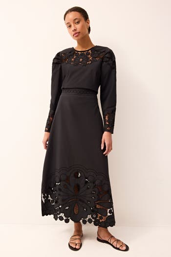 File our new Eugenia skirt in Noir under items of clothing you’ll keep in your closet forever. The timeless black midi skirt is fitted through the hips and gently flares out towards a show-stopping hemline that’s edged in lace embroidery. Side seam invisible zipper with hook & eye closure Embroidery and lace detail along hem Side slits 100% cotton Unlined Care Instructions: dry clean only