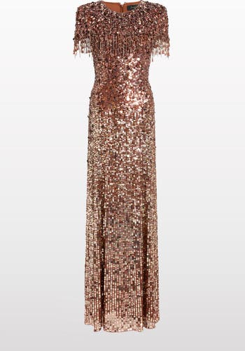 Jenny Packham Eugenie Sequin Fringed Maxi Dress, Main, color, Bronze