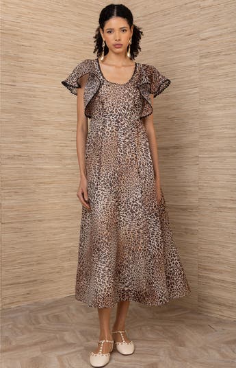 Crafted from airy silk linen organza, this midi dress features a fluid silhouette with soft movement and a refined leopard print. Delicate ruffle sleeves and a flattering fit create an elevated look that transitions effortlessly from day to evening.