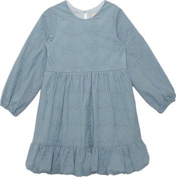 - The Eva Dress combines timeless design with thoughtful details for young style enthusiasts. This light blue dress showcases embroidered floral patterns that add texture. Featuring long sleeves, a round neckline, and a gathered waistline leading to a flared skirt with a ruffled hem, it offers both comfort and elegance. A subtle back opening provides a practical yet refined finishing touch?perfect for everyday play or special outings. Fabric Content & Care 100% COTTON Machine Wash Cold
