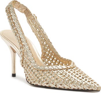 Step out in glamorous style with this woven slingback pump featuring a pointy toe and lofty stiletto heel.