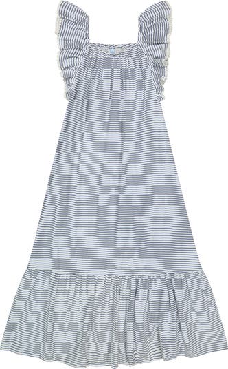 The Eva Ruffle Sundress offers relaxed elegance for the summer season with a swingy style and open flutter sleeves that may be worn belted or loose and free. The peplum hem and maxi length give you an extra-flowing look that you'll be sure to love. Enjoy the feeling of summer in this favorite sundress. 100% cotton. Model is 5.9. Length 48".