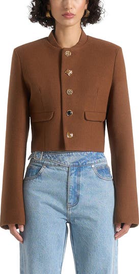 Defined by sharp lines and modern proportions, this structured wool jacket delivers a refined balance of tailoring and contemporary edge. The stand collar creates a clean, streamlined finish, while functional front pockets add everyday practicality. Bold gold statement buttons complete the design with an elevated accent.