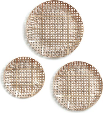 - With a sloping edge and stamped iron texture, iron strands are woven together to create a dynamic wall feature. This well-scaled set of three are finished in a warm champagne. A stunning set for the modern home.