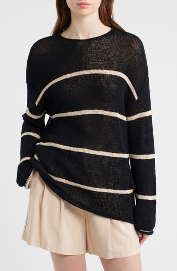 Breezy comfort is a given in this roomy boat-neck sweater knit in a lightweight stitch of cotton- and linen-blend yarns and finished with stripes and rolled edges.