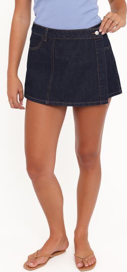 Fall for the wrapped silhouette of this stem-showing skort made from dark-wash denim.