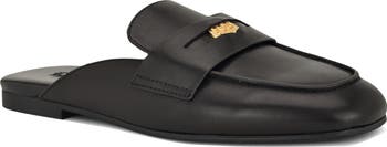 An ornate hardware coin peeks out from beneath the penny keeper of a loafer-inspired mule featuring a streamlined profile and slender square toe.