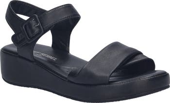 An adjustable ankle strap offers a customized feel and secure fit on a cushioned leather sandal featuring a chunky platform and integrated wedge heel.