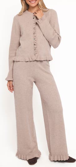 Your new go-to for effortless elegance, this matching cardigan and pants are knit with ruffled ribbing at the placket, hem and cuffs, while the top is fastened with smoky mother-of-pearl buttons.