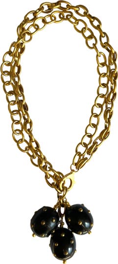 Like a gorgeous, decorative bunch of grapes! Eve features 18" of double layered 12k antiqued gold plated stainless steel chain, three unique vintage studded ball beads and an oversized 12k antiqued gold plated pewter lobster clasp. Clasp it anywhere along the chain to change the length :)