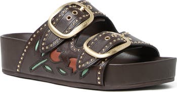 Floral cutouts and polished studs add playful personality to this two-strap platform sandal.
