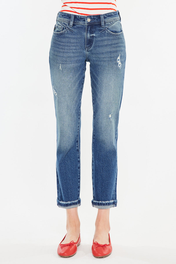 Evelin Mid Rise Cropped Straight Jeans are perfect for a casual summer jean. In a Dark wash color cropped at the ankle so you can show off your favorite pair of sandals or flats! Made from a stretch Denim fabric to give you that all day comfort. Sits on your hips and tapers down to a single cuff hem. With very light distress details throughout the jeans. Features a classic 5-pocket style, button closure, and zip fly.