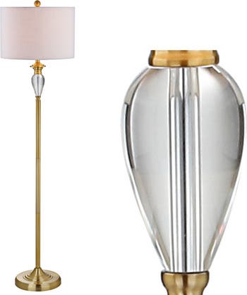 Supported by a round pedestal base, this gleaming brass floor lamp that culminates in a smooth crystal orb with and finial. A crisp cotton drum shade adds casual warmth and a silk-wrapped cord complete the piece. You'll love the way the crystal accents seem to illuminate when the lamp is turned on.