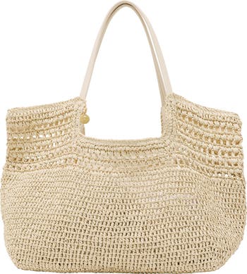 A cut-out handle design makes it comfy to carry this roomy vacay-staple tote made with a woven-raffia effect.