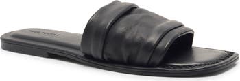 Supple leather gathers into a softly scrunched vamp that brings subtle texture to this understated slide sandal set on a low-profile sole.
