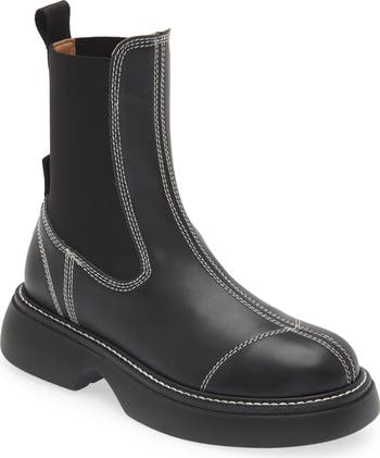Contrast topstitching lends visual intrigue to a sturdy Chelsea boot grounded by a chunky heel and durable lug sole.