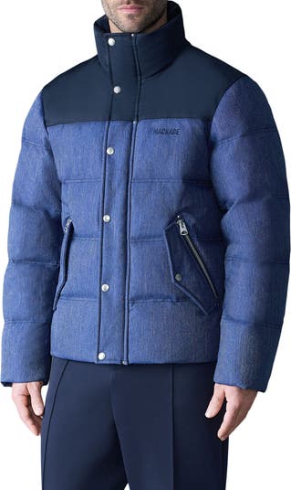 A contrast satin yoke refines the look of this water-resistant puffer jacket featuring a channel-quilted technical-denim body insulated with plush down.