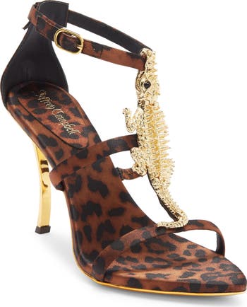 Make every step shimmer when you wear this sleek satin sandal with a gleaming alligator accent on the front strap and golden accents on the sole and curved heel.