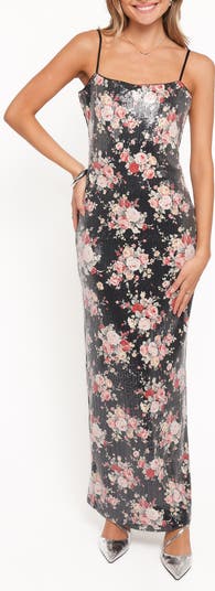 Allover shimmering sequins highlight the romantic floral print of this floor-grazing maxi dress detailed with a step-easing slit at the back hem.