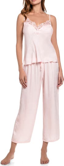 Delicate lace highlights the shimmering satin of this pajama set that pairs a camisole and cropped pants.
